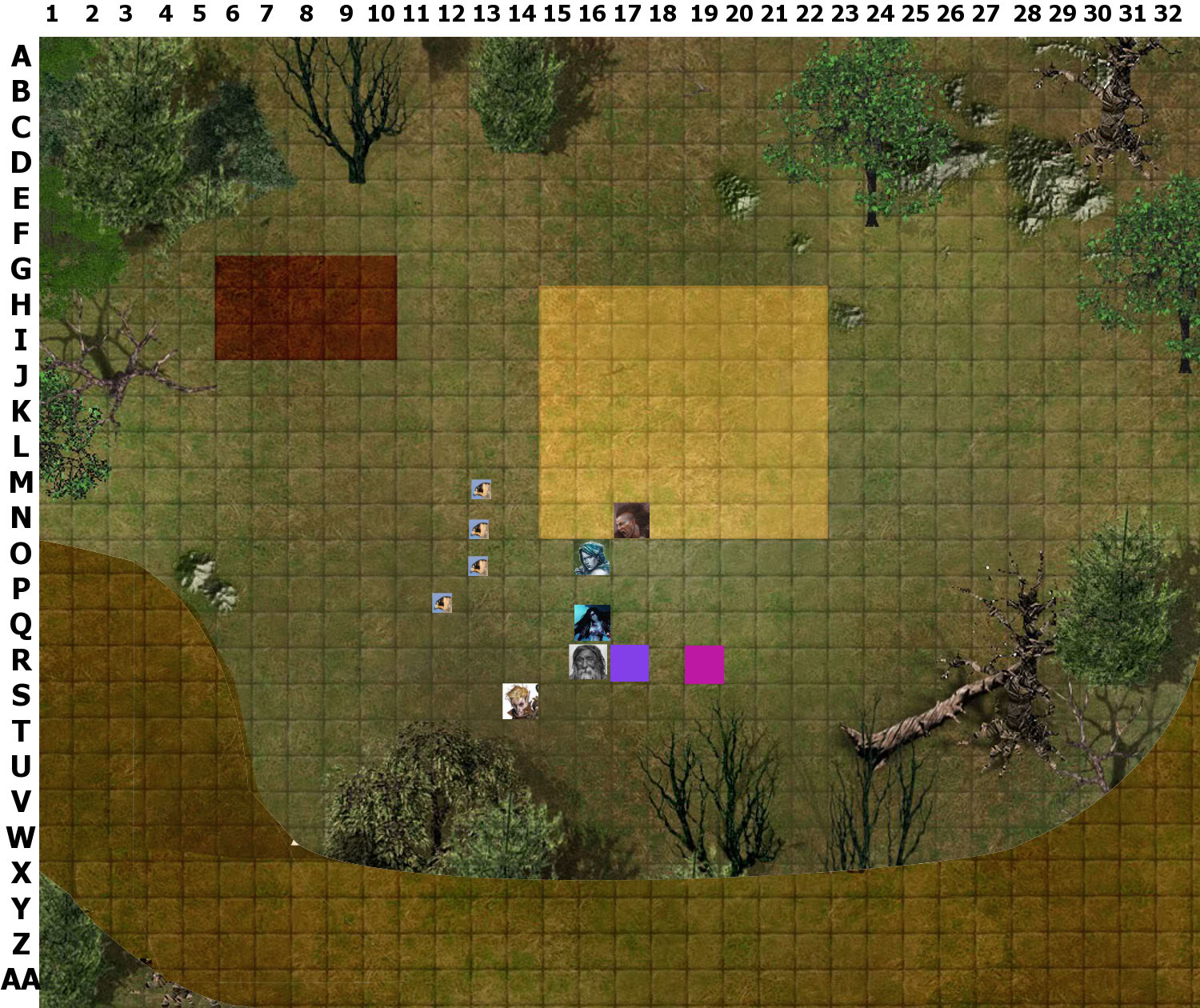 Quioan is up. Hopefully this map works. Hlaalin didn't have a picture on the wiki so I just took the Alchemist from the SRD. The magenta square is Roug; the purple one is Ryall. The brown strip at the bottom is the road, the light square the dirt foundation, and the darker strip the garden. There's no terrain penalties, though.