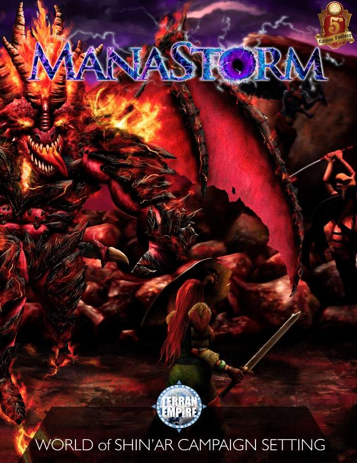 The long awaited and highly anticipated Manastorm: World of Shin'ar (5e) is now available! This full color - 530-page - campaign setting is compatible with D&D 5e and features 16 new playable races, new classes, backgrounds, skills, feats, spells, monsters, and more! The planet of Shin'ar is broken into 10 expansive regions, each fully mapped and described in great detail with enough information to keep your players adventuring for years to come! Come and see if you can survive a Manastorm!