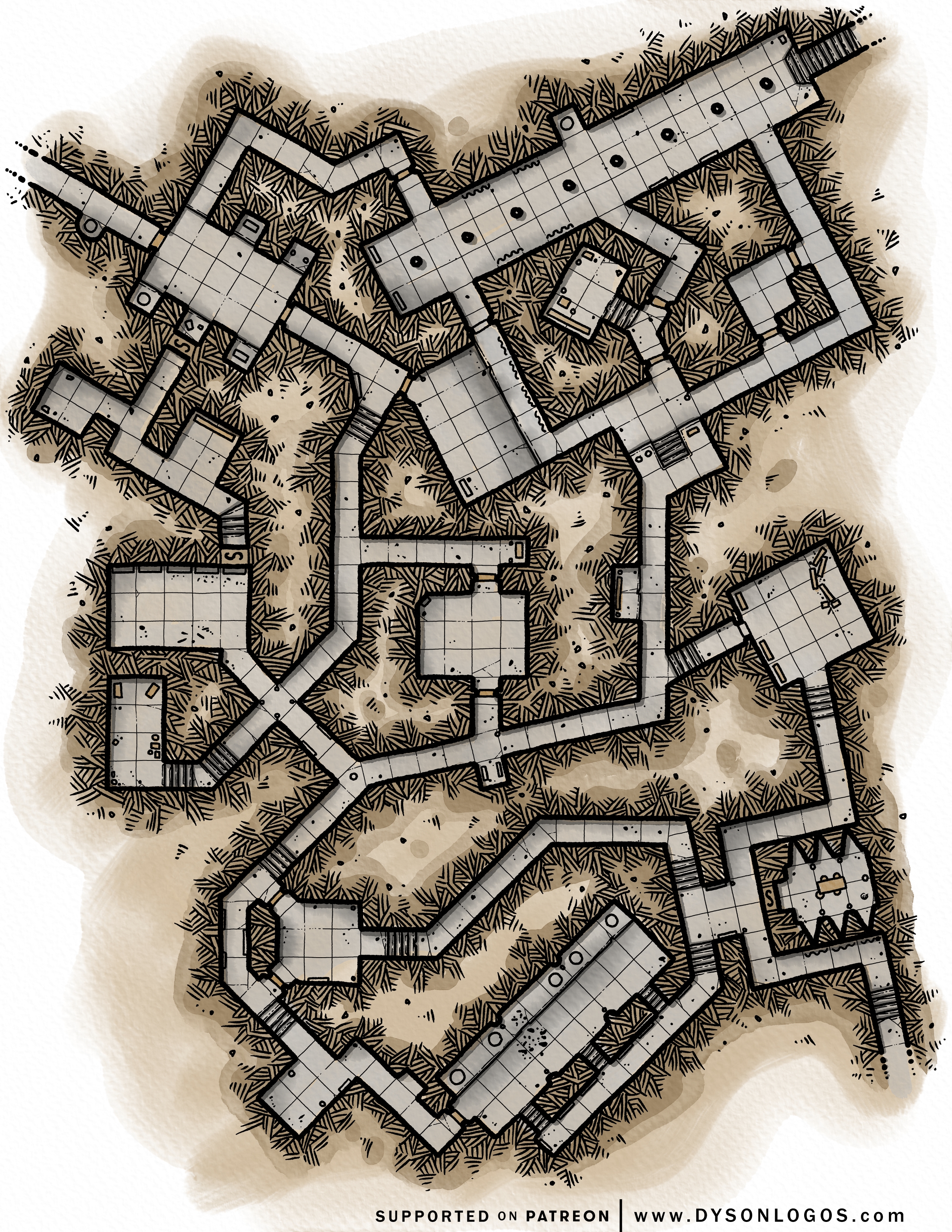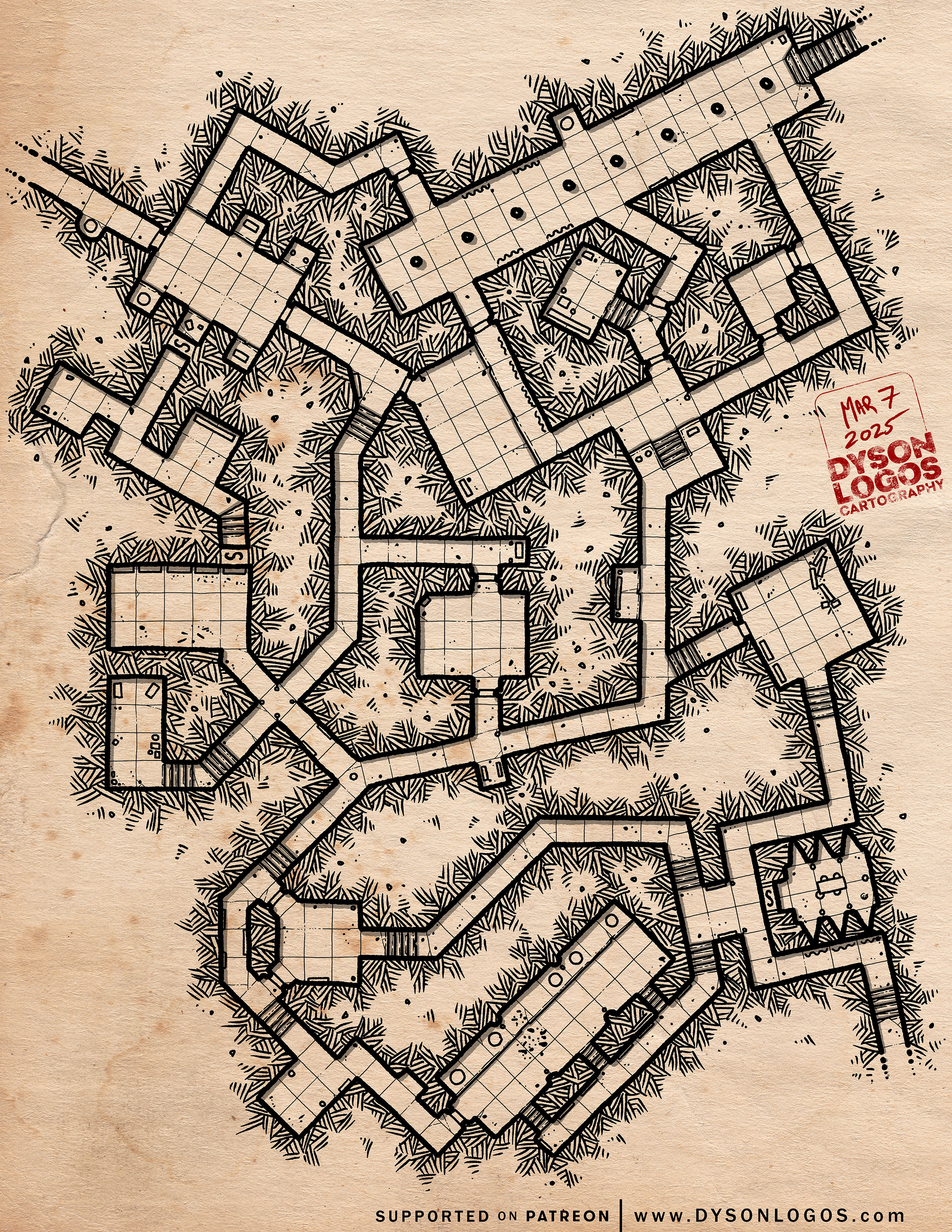 The 1200 dpi versions of the map were drawn at a scale of 300 pixels per square and are 9,000 x 5,400 pixels (30 x 18 squares). To use this with a VTT you would need to resize the squares to either 70 pixels (for 5′ squares) or 140 pixels (for the recommended 10′ squares) – so resizing it to either 2,100 x 1,260 or 4,200 x 2,520, respectively.