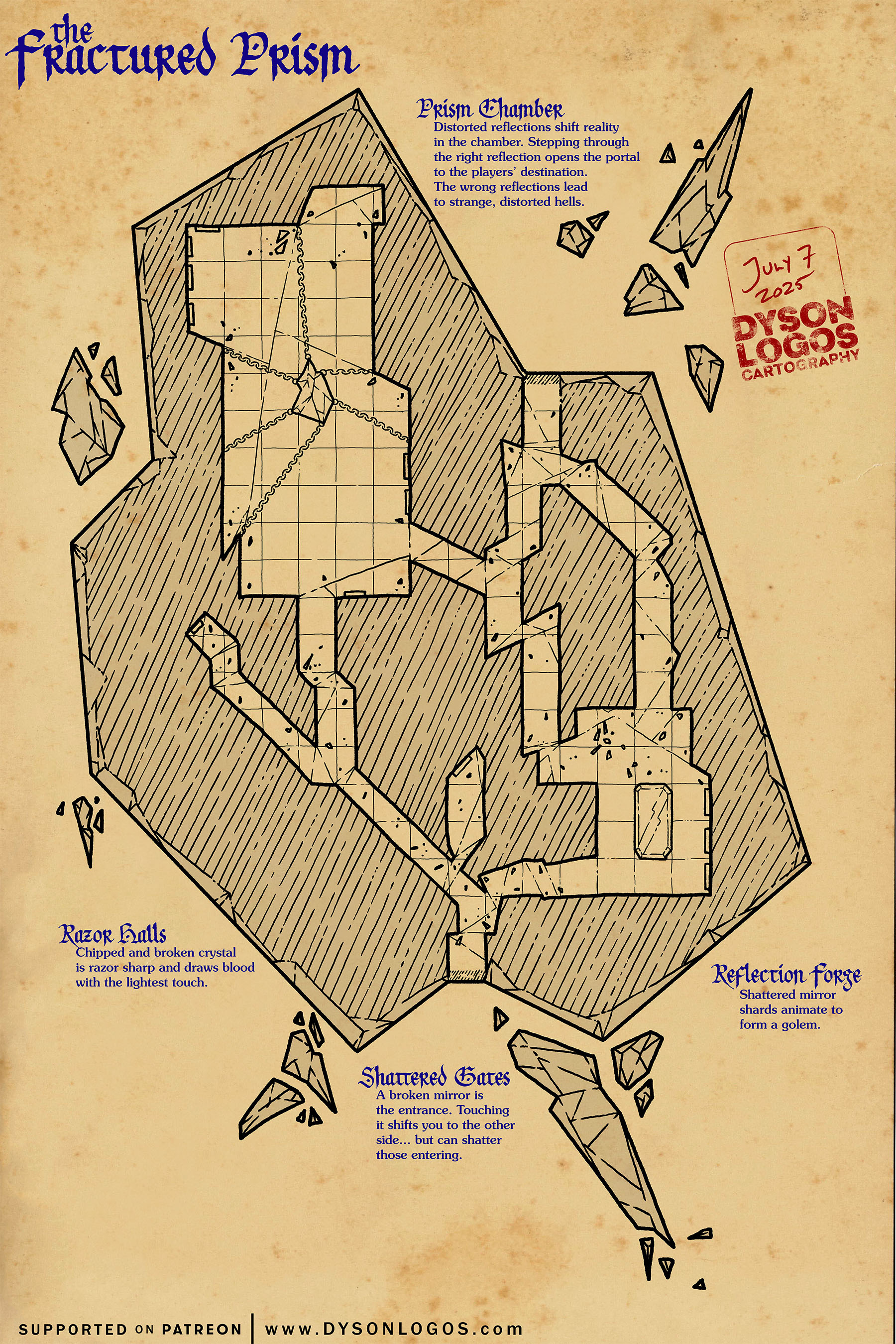 The 1200 dpi versions of the map were drawn at a scale of 300 pixels per square and are 9,000 x 5,400 pixels (30 x 18 squares). To use this with a VTT you would need to resize the squares to either 70 pixels (for 5′ squares) or 140 pixels (for the recommended 10′ squares) – so resizing it to either 2,100 x 1,260 or 4,200 x 2,520, respectively.
