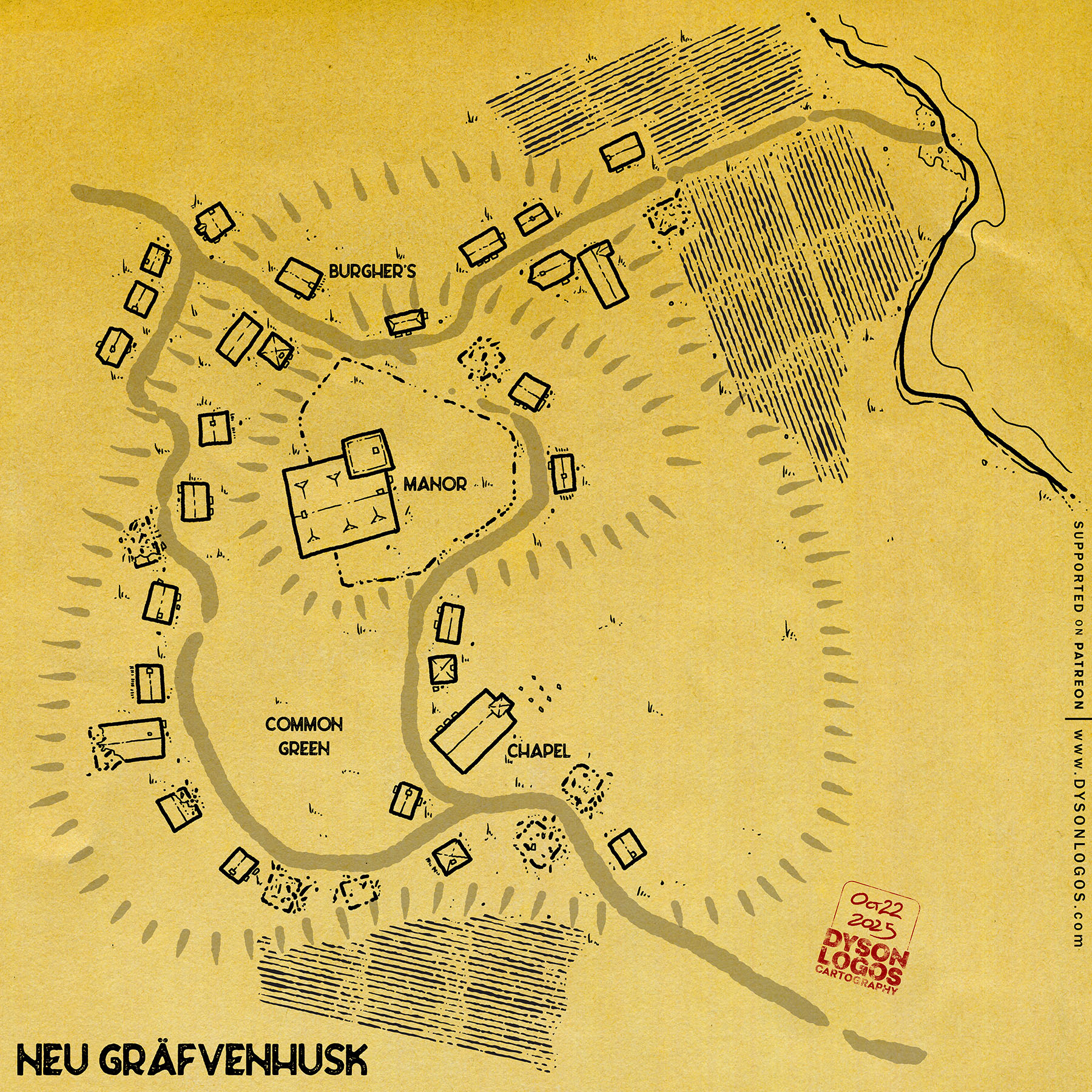 Neu Gräfvenhusk (300 dpi promo) While putting that Mörk Borg Hallowe’en adventure together, I decided to add one more map. This is the remains of the village of Neu Gräfvenhusk along the bank…dysonlogos.blog
