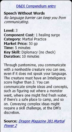 I agree completely. My last 1-30 game had a Bladesinger as one of the 3 PCs. He had Spook and Suggestion and an absurd Arcana check. Level 0 Utility Powers (especially when you have a suite of them by default) are extremely powerful as 1/encounter subs without any narrowing of the fictional trigger (eg Sub Arcana for Intimidate if you've already given this enemy a reason to fear you or fear magic) or cost (eg spend a Healing Surge). The former works well for Dungeon World. The latter works well for 4e.
