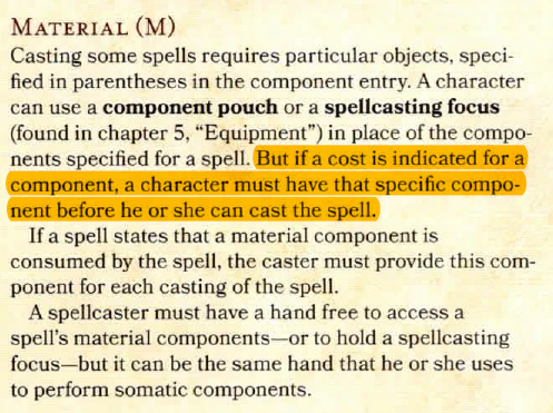 But for spells with components with a cost, especially those which the spell consumes, you must have them in order to cast the spells. That is what the rules "tell us." Component pouches and foci don't replace those costs and components. :)