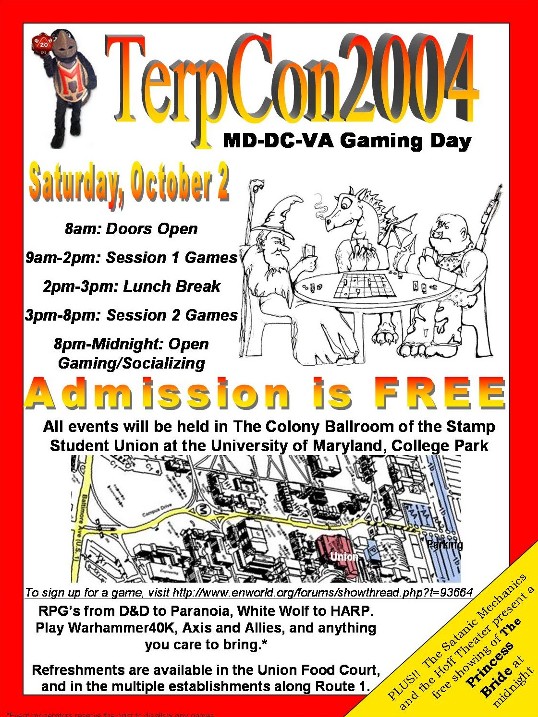 Here's the poster from last year ( http://www.enworld.org/attachment.php?attachmentid=16363 ) This one is exactly the same except for a few things. Ignore the Princess Bride tab at the bottom. We're not in the Colony Ballroom, we're in the Bannaker and Jiminez Rooms. Also it's April 2, 2005 NOT October 2, 2004.
