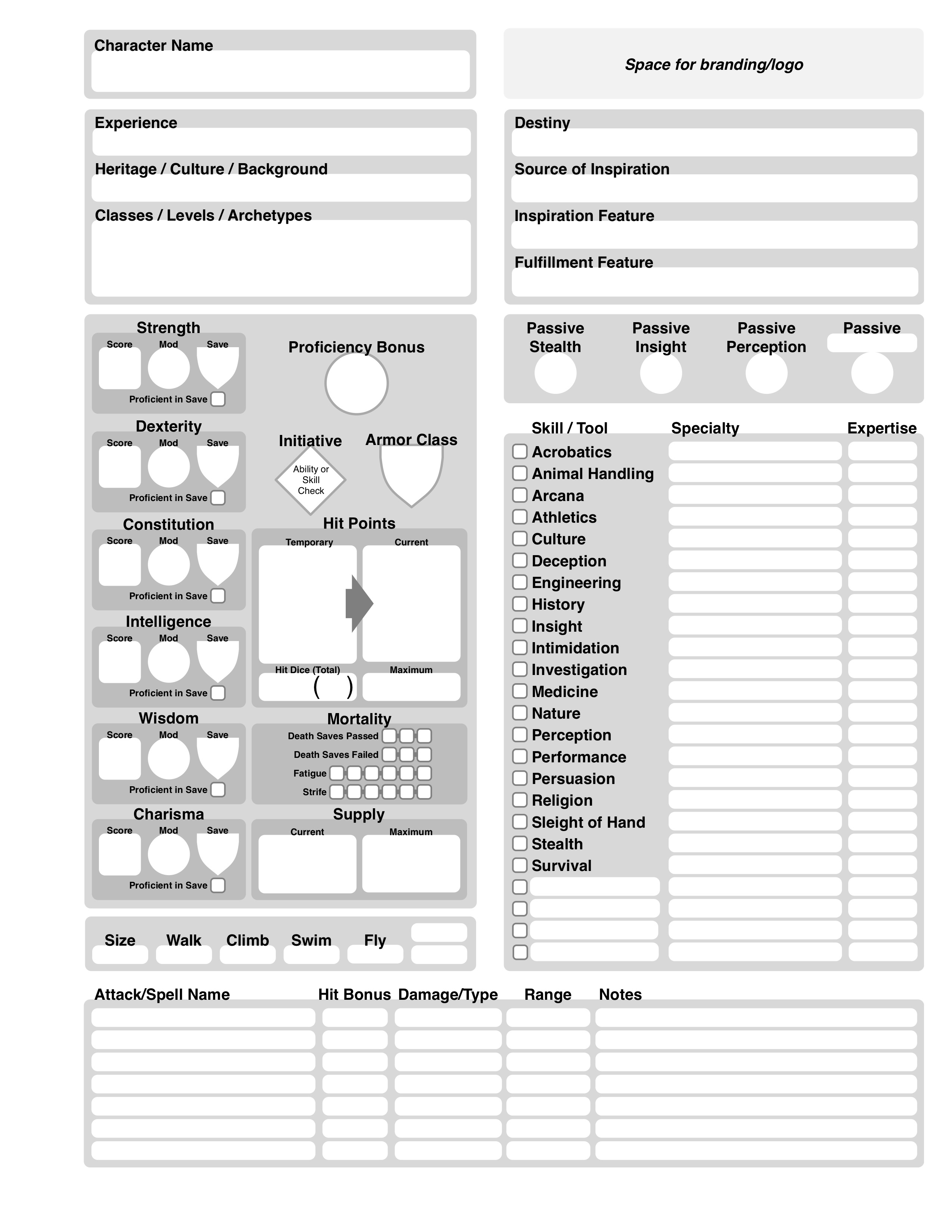I find the official A5e character sheet a little hard on my eyes, so I thought I'd mock up a minimalist design that's easier to scan. I would like to do this with the heading font used in the rulebooks but I don't know what it is, so it's good old boring Helvetica for now.