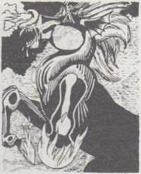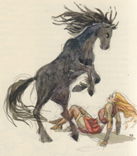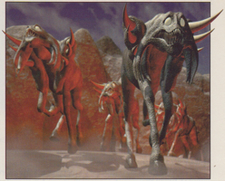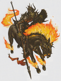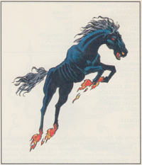 We get a little bit more about their combat abilities. Their burning hooves will set combustibles on fire, and their cloud of hot smoke has a range of 10 feet and requires a save vs. paralyzation to avoid the penalty. The fact that their flight is a magical ability is spelled out, and we learn that they can understand commands from "evil riders" (why only evil riders?) and that they use "empathy" to communicate with each other, which is regrettably vague.