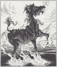 Looking at the illustration, you'd be unlikely to use the words "skeletal" or "gaunt" to describe this beast. Nightmares remain willing to serve as steeds for exceptionally evil riders, but they require a sacrifice before they exhibit any level of loyalty to the creatures they serve. A nightmare's red eyes glow with malevolence. It is completely immune to fire, and grants fire resistance to any rider.