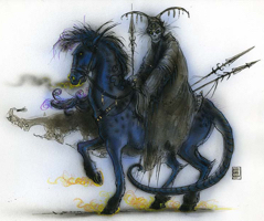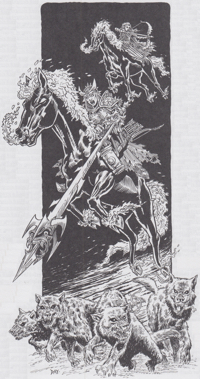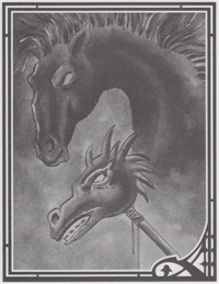 Although these two rulers hate each other, they meet in the Shadowfell once each year to mate and produce three exceptional foals. One of these offspring remains on the Shadowfell, while the other two return to the home planes of each of their parents. The article suggests that these two rulers were originally servants of Vecna, but have been corrupted by their home planes, and that Vecna now plots their demise. The article finishes with a mention of the legendary Gloom Meet and the role that nightmare play in announcing this planar event. It is said that one way to find the location of the Gloom Meet is to follow the trail of scorched hoof prints.