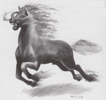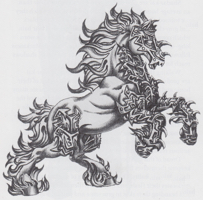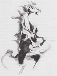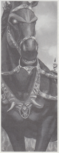 The black unicorn (detailed in Unique Unicorns in Dragon #190) is also sometimes called a nightmare, but isn't a direct relative of the true nightmare. Similarly, the article Destriers of the Planes in Dragon #243 details nine magical steeds with planar origins, one associated with each alignment. Although none of them are noted as related to nightmares, the charnalbalk is an emaciated, coal-black equine with smouldering eyes, native to the Abyss, and some sort of common ancestry with the nightmare seems quite plausible.