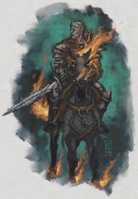 A boxed set released towards the end of 4th Edition, The Shadowfell: Gloomwrought and Beyond, provides a little more detail of the shadar-kai relationship with nightmares. We learn that some shadar-kai have mastered a tactical manoeuvre where they leap from the backs of their nightmare steeds directly into combat. Svyn, the religious leader of the network of mountain caves known as Thyrin Gol, roams the Shadowfell on the back of a nightmare steed named Sear, searching out the mysteries of the plane. There are also rumours that a jet-black unicorn has seized the leadership of the herd of nightmares living in the nearby Gol Mountains.