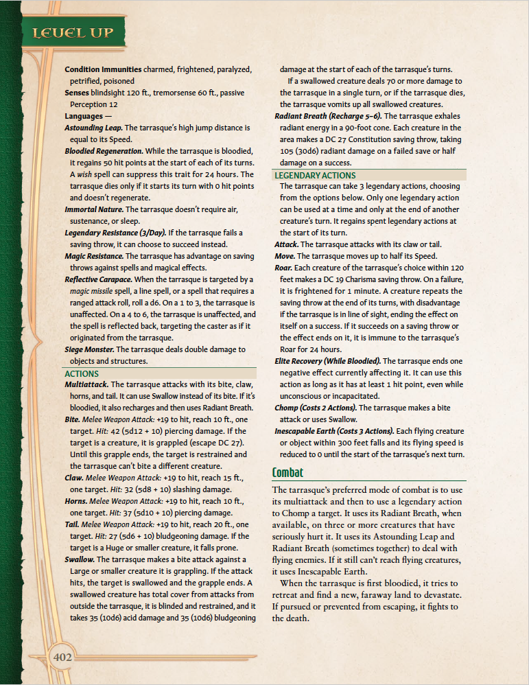 Tarrasque - Now we are talking! You fixed the biggest issues with the 5e tarrasque, which is the lack of regeneration (seriously a Mr T that cannot regenerate is no T to me!) and the inability to deal with flying creatures. You have solved both in great fashion, I love the earthbinding callback to the 4e Tarrasque. That jump is super cool, this is a tarrasque that gets it done! If I were to change anything (which is more of a preference) is I would drop legendary resistance and just make elite recovery on all the time.... that gives me more the vision of a monster that just never stops, never runs out of juice, just keeps going and going. But again that's more preference than a real issue. The only other one for me, it would be neat if a saving throw success against the Roar did not make you immune to the fear. Aka this is the one creature that is so badass, even if you steady your nerves for a second, its so primal that a second blast will bring the fear tumbling back. I think for most creatures the immunity makes sense, but Mr T could be the exception.