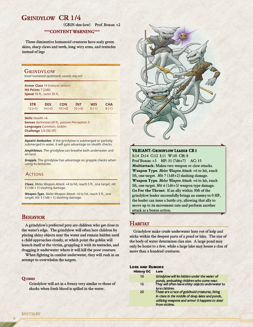 Apropos of formatting, I assume Go For the Throat uses a reaction? I feel like the grindylow leader should be its own stat block.