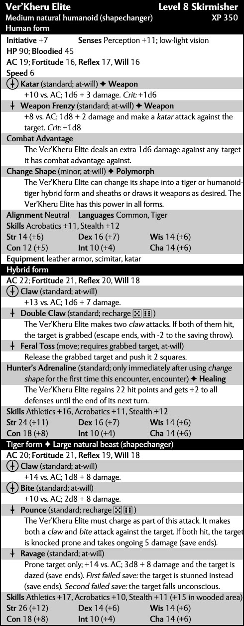 I made a weretiger. In my campaign, there's a city called Ver'Kheru where the upper-class are mostly weretigers, and I really don't like the 4E Monster Manual's lycanthropes, so I made my own system for them. They're obviously a pretty important aspect of my campaign to use a basic lycanthrope system I don't like. Anyway, here is a stat block for a Ver'Kheru Elite—one of the city's higher-ups.