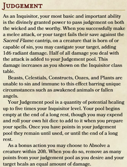 What if Paladin but Rogue and More Casty? The Inquisitor is designed to be a new type of spellcaster, the 3/4 caster. With up to 7th level spells, they'll have a lot of tools at their disposal, but their healing functionality will be offloaded into the class, itself, rather than spending a big chunk of spell slots on healing magic, leaving your slots free for Utility, Buffing, and Area Denial. If ever, oh ever, there was a class that used Magic Circle for fun an profit, it's the Inquisitor!
