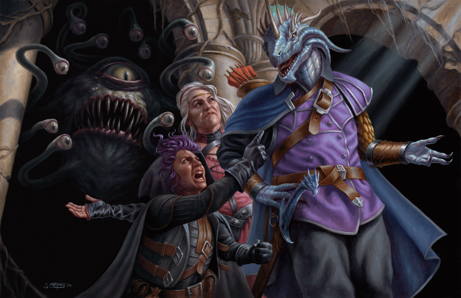 Good point. Maybe I'll register on that site and ask the artist lol. I think the intent is that the halfling is looking at the Dragonborn but yeah it's very weird sight lines etc.