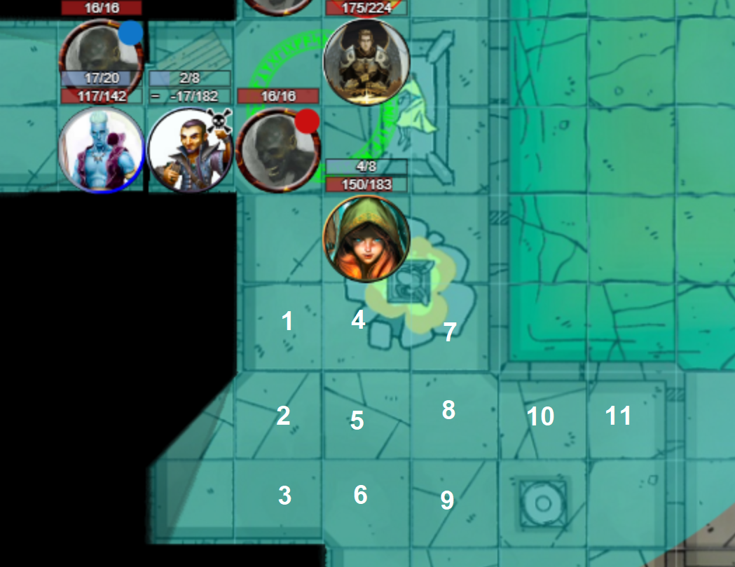 (Man, I really should have made her a scout. She moves 25 feet to the square south-west of Selossen, TPs to the square 10 feet east of Vecna (next to the brazier), and walks the last 5 feet back to him before attacking. Hopefully she doesn't set off any traps.)