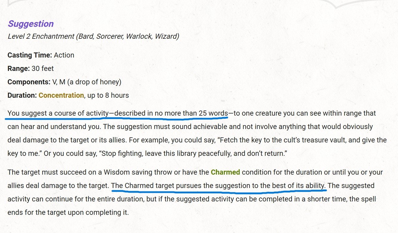 Yes, that is also in the text. As is "The Charmed target pursues the suggestion to the best of its ability." I'll add the screenshot again and underline the respective passages.