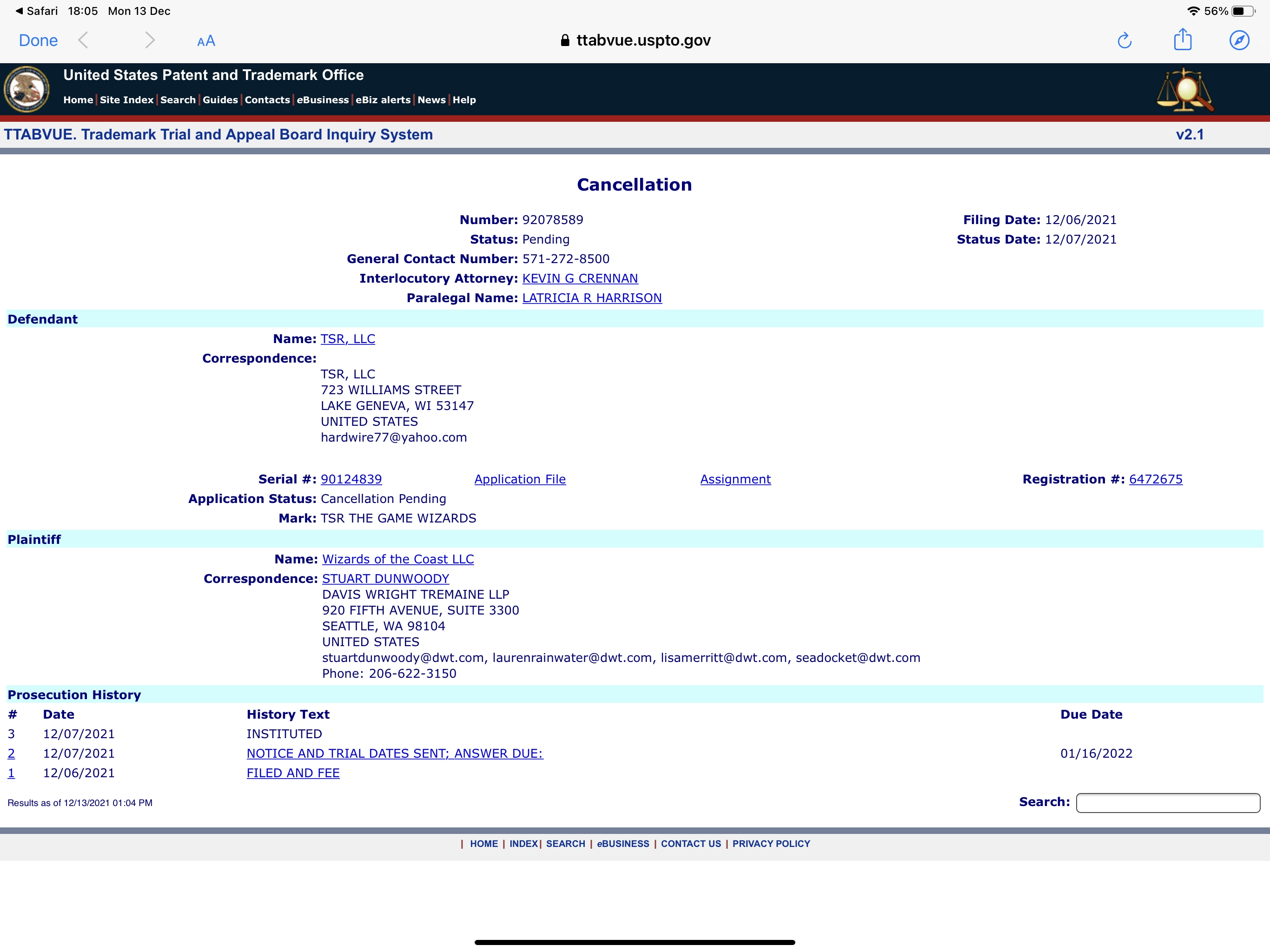 I guess after you provoke somebody enough, they’ll eventually bite back. The company has begun trademark cancellation procedures against the newest TSR. TSR3 briefly filed for a court declaration on Dec 7th as to their ownership of the TSR trademarks — with an IndieGoGo campaign to fund it — and then voluntarily dismissed it a couple of days later on Dec 9th. This filing is dated Dec 6th...