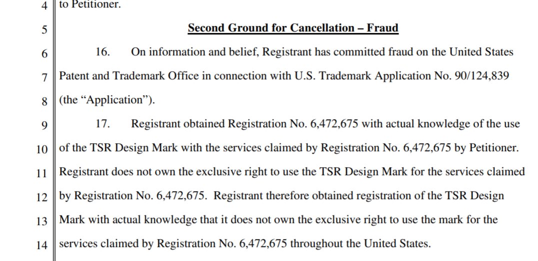 In WotC’s response, they cite fraud as one of the causes of action, alleging that TSR3 misled the trademark office in its original application.
