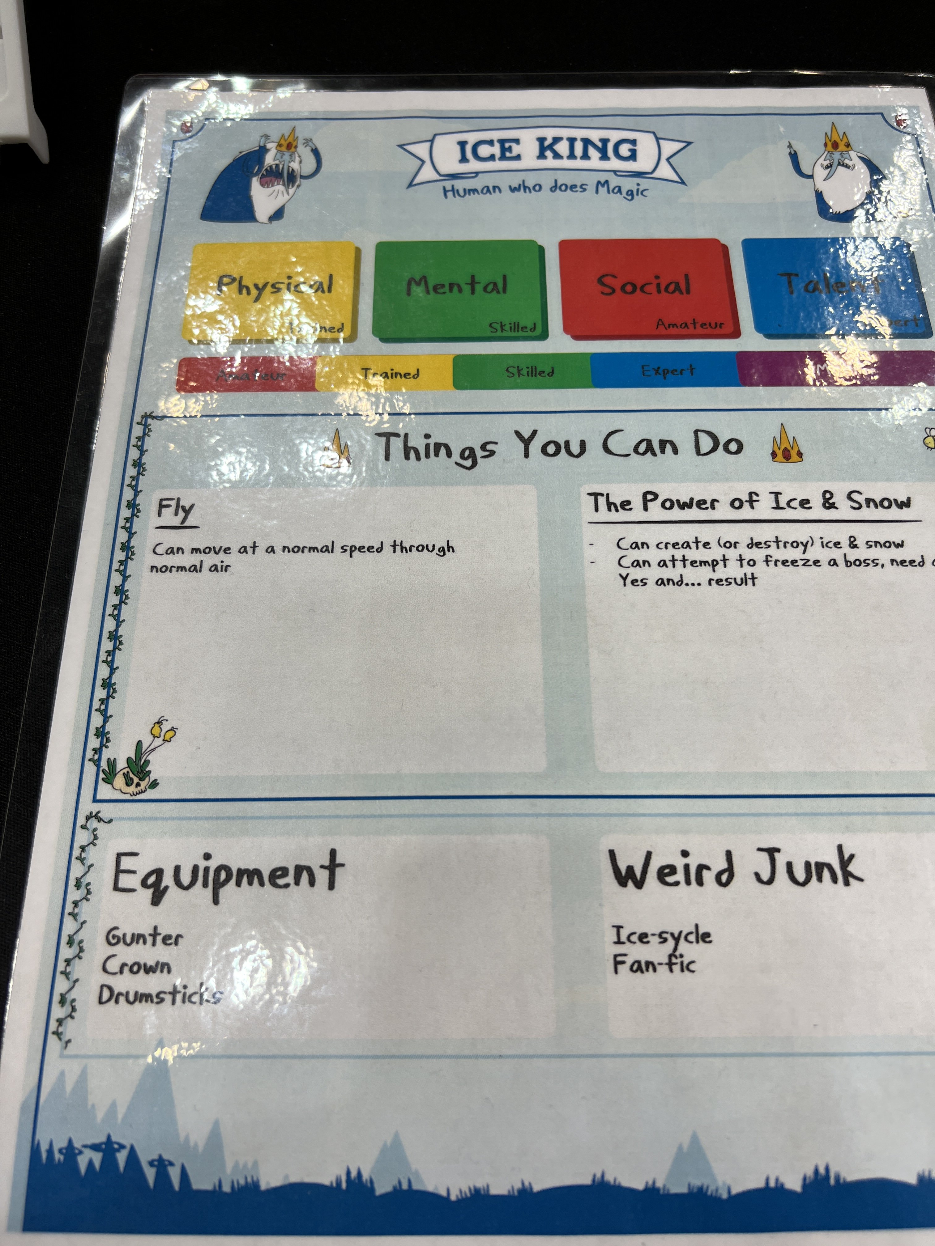 Rules heavy AD&D vibes vs story game vibes is something we thought a lot about. And while I totally agree there is some big classic RPG energy going on and AT was so clearly inspired by D&D, the actual FEEL of how those things play out narratively in the show(s) very much pushes away from strictly constructed simulation sorta systems. "How much damage does Finn's sword do" is not something consistent throughout the show, or even the way the show would ask that question. If a head needs cutting off, a head gets cut off, vorpal or no.