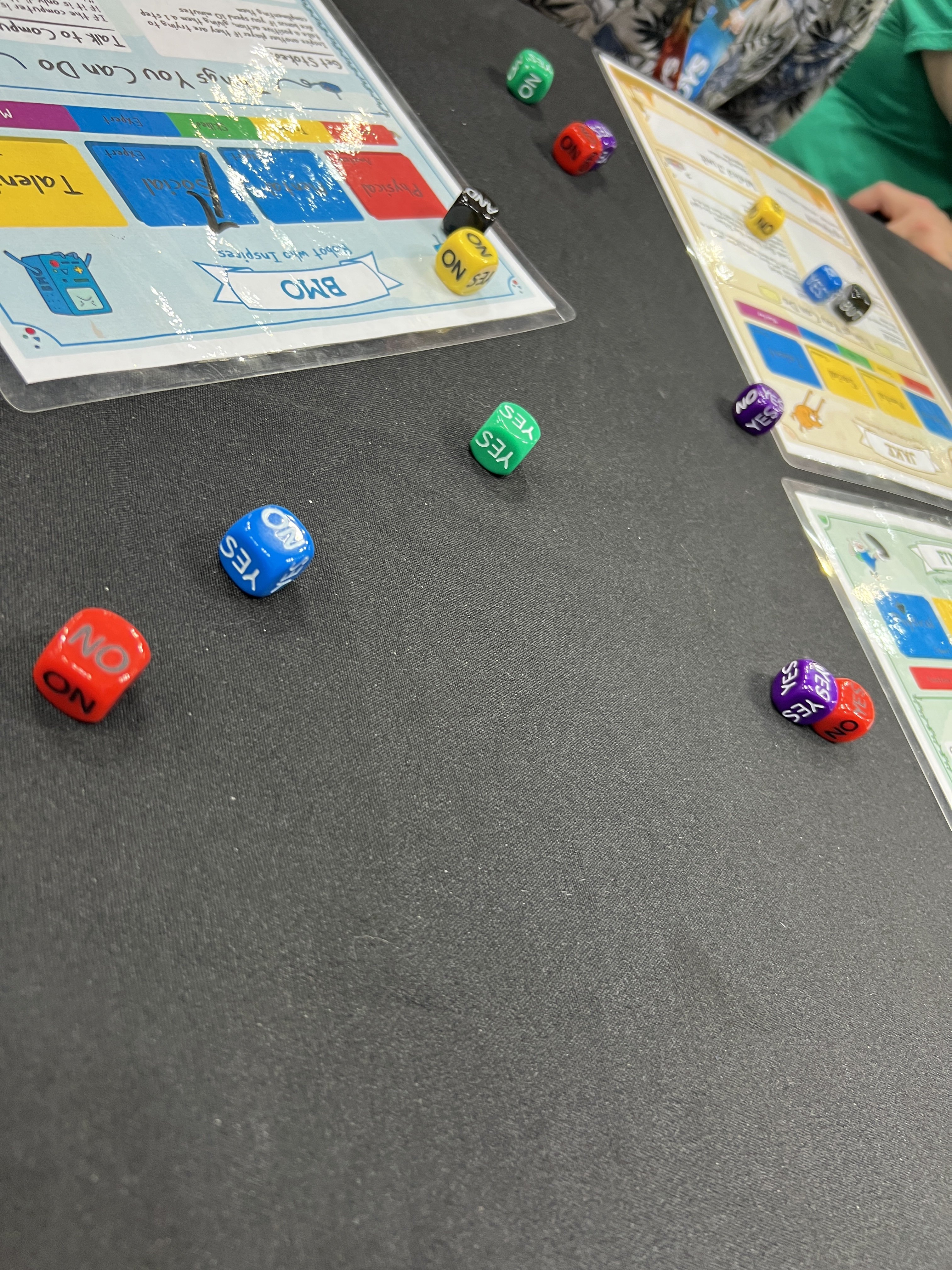 The color coded dice are also an accessibility issue, which is especially ironic given Finn is colorblind.