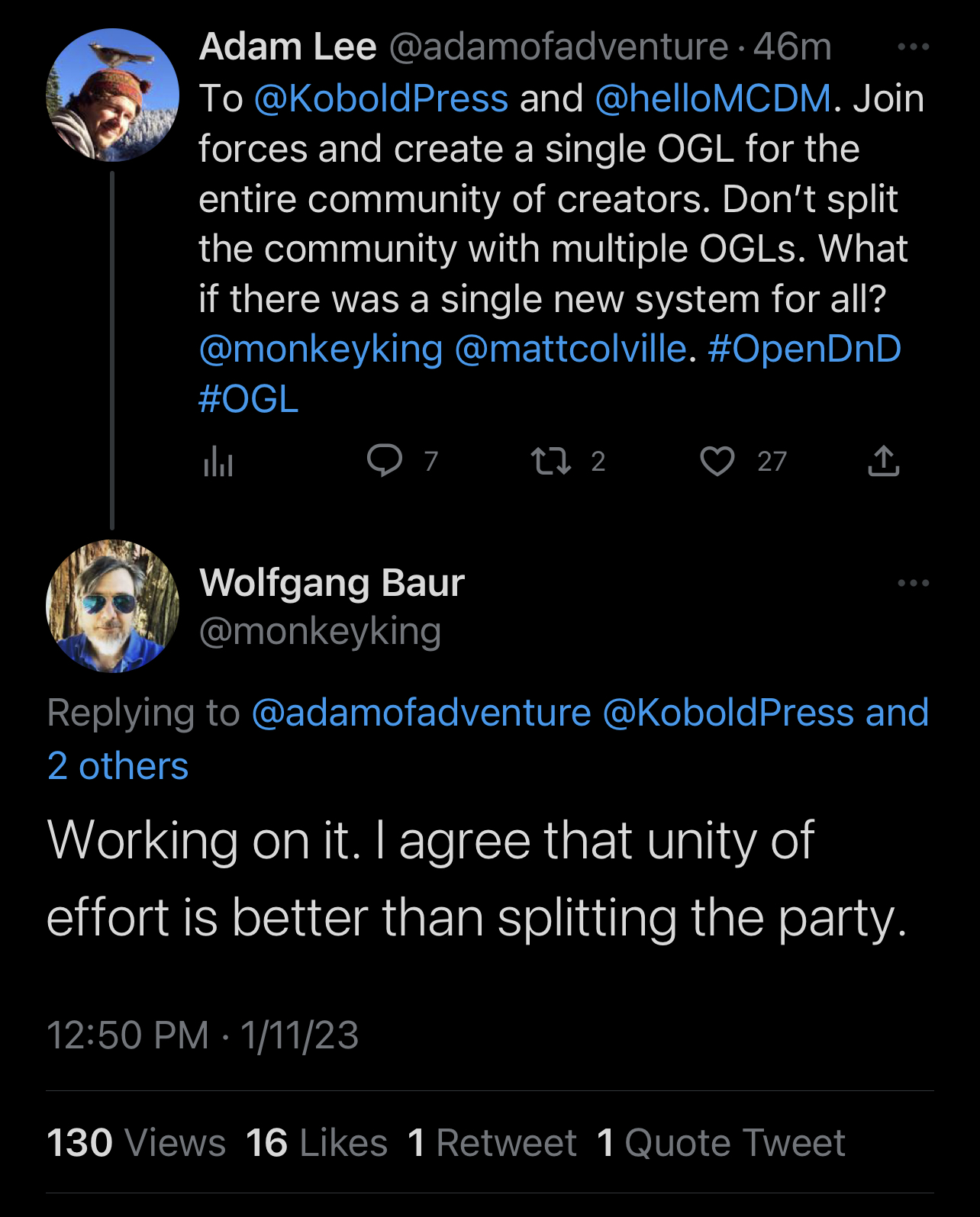 Going forward, it would be nice to have one standard open gaming license that most used, just as we've had in the last 20 years. It would also be nice to have one or a few consensus systems so that many things that come out will be compatible with what many people play. But those are two separate issues.