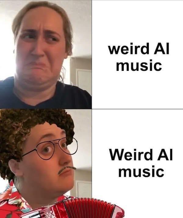 1. Unfortunately, due to the fact that we have a messed-up alphabet, I can't tell the difference between Weird Al, a person I love, and and Weird AI, which is a hallucinatin' mess that inspires angry comments. I blame the Phoenicians.