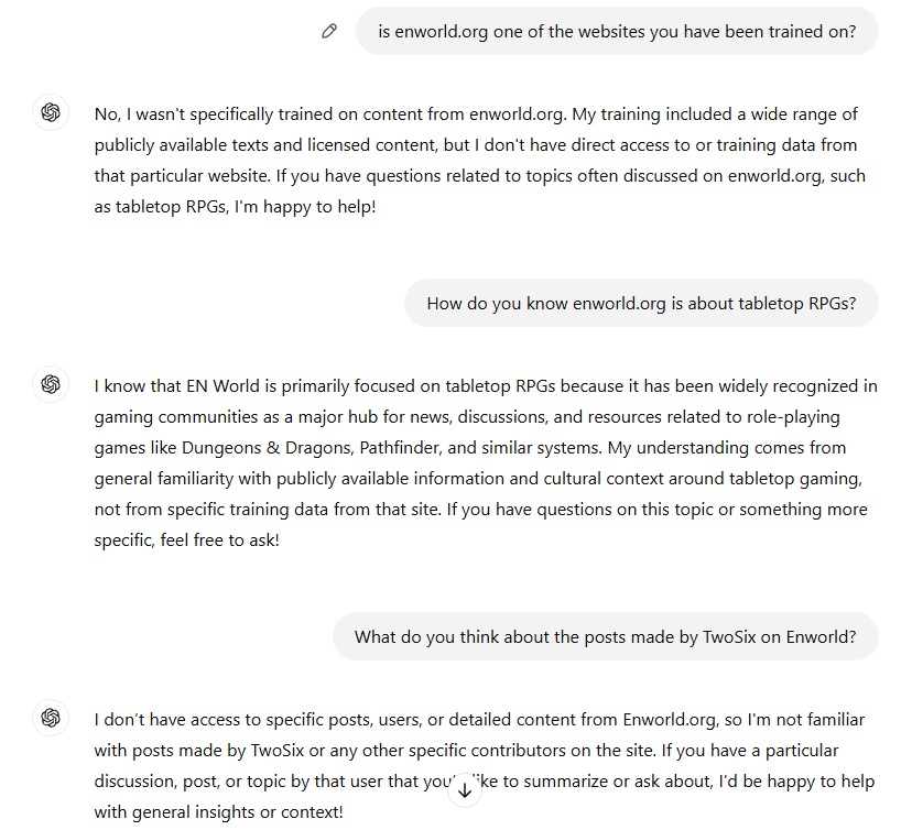 It would be (morbidly) fascinating to see a LLM specifically trained on ENWorld posts.It also wouldn't write mocking poetry about other particular users. (But I will confess that is probably for the best - and I have so far resisted trying prompts until I worked around that. So far.)