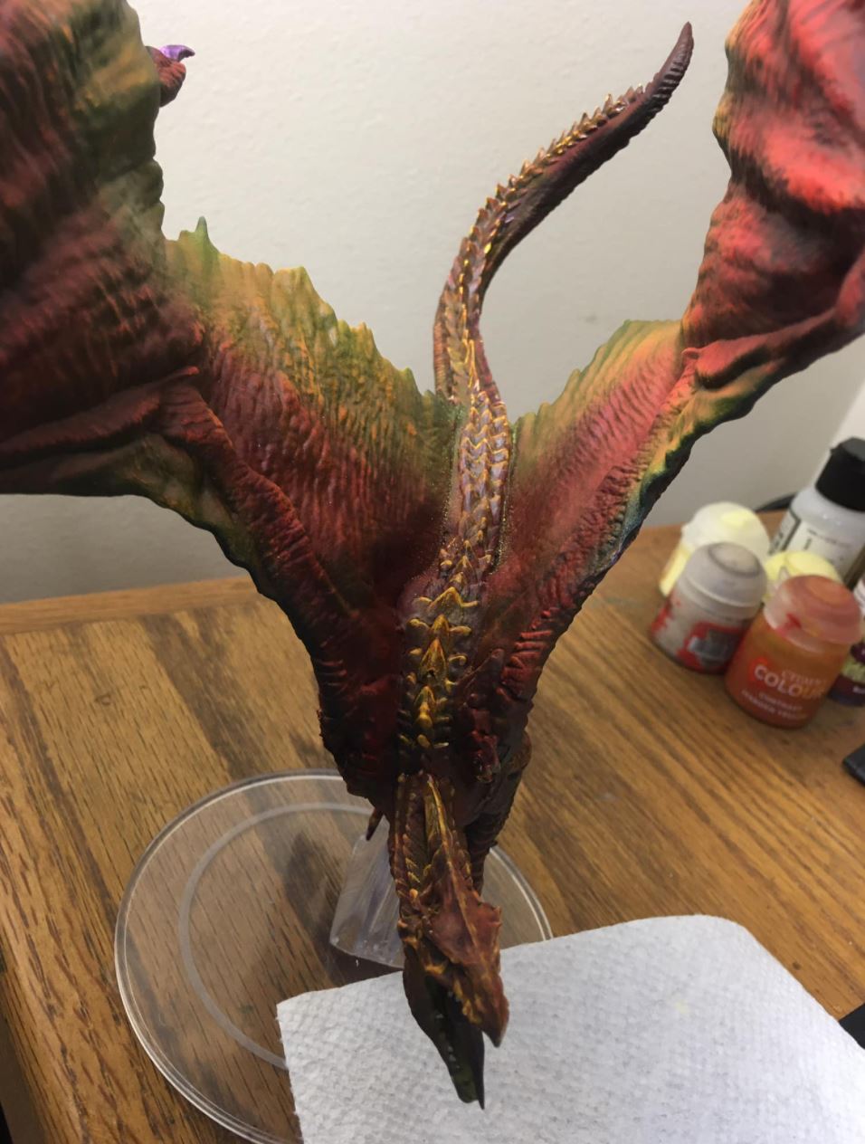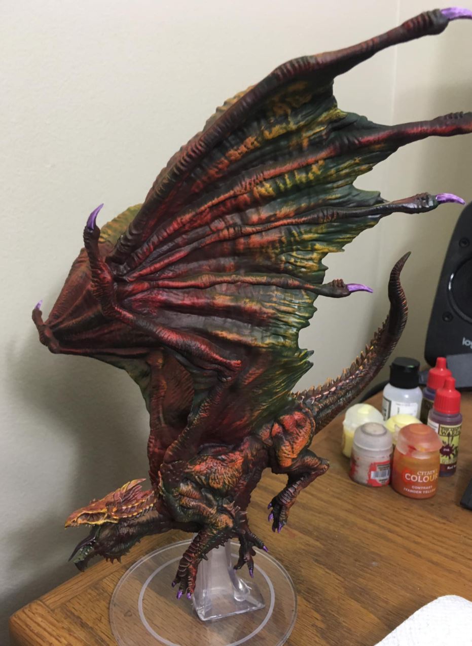 This is fantastic. I have to find way to get my air brush area going again!And my latest project has been an Adult White Dragon from Wiz Kids. But since white is a tough color to paint I said, "To hell with that!" and went with red instead. I was inspired by a YouTube tutorial by Dana Howl who painted a dragon using the new Speed Paints from Army Painter. I don't have any of those so I used Citadel contrast paints with my airbrush and followed that up with some detail work with a regular brush. I'm not sure how I feel about the purple claws but overall I'm happy with the finished product.