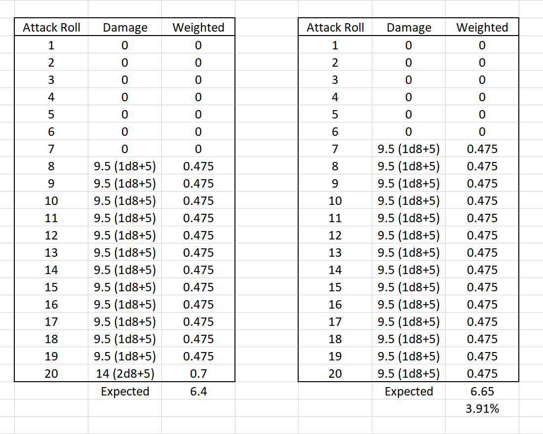 The fun observation here is that the difference between the two comes entirely from the fact that the static bonus is not doubled for the crit. Otherwise, doubling the dice (and thus the expected value of a single hit) on a 20 yields the same expected damage as a +1 to hit and no crits. A character without a damage bonus at all (like with a strength 10-11) would have the same expected damage value using either table.Personally, I am all for removing critical hits from D&D entirely.