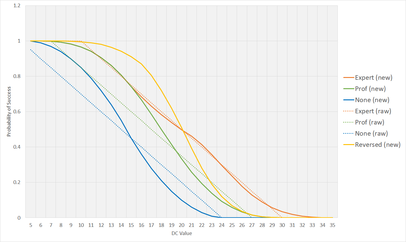 So, I see your point about proficiency and non-proficiency for DCs at or below 20 and 15, respectively. Conversely, above those levels, the probability with your idea makes things harder. That wasn't one of my goals. As I said before, hard tasks are already hard with only proficiency and ability, making them even harder is counter-productive. I am not sure where the confusion lies that led you to think otherwise. If something I wrote misled you, my sincere apologies!