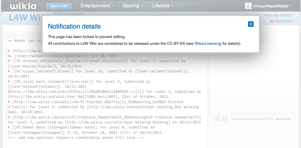 You can see that I am clearly logged in (top-right corner), and the notification shown describes the fact that the page is locked.