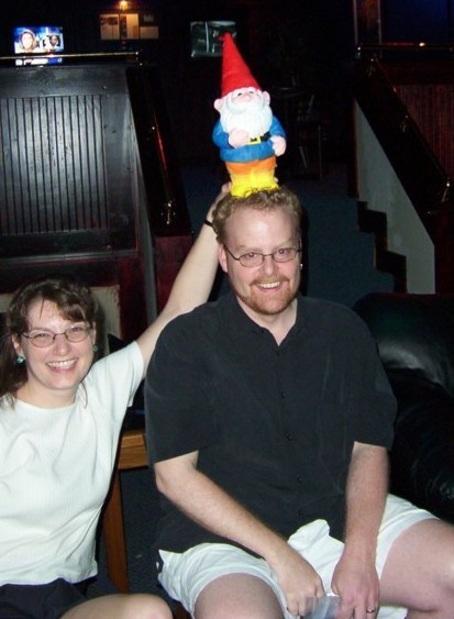 I was at the bottom of the stairs leading to an apartment in the basement of a building. The door opened, and I rolled over to look. I don’t know who opened the door, but he was holding a bemused look on his face. Not that I noticed. I was looking into the building at a pair of all too familiar faces. Sue and Monte Cook were sitting there. Apparently there was some sort of game designers party going on. I’m not sure why the gnome was on Monte’s head, but judging by the look on Sue’s face, she had won the round.