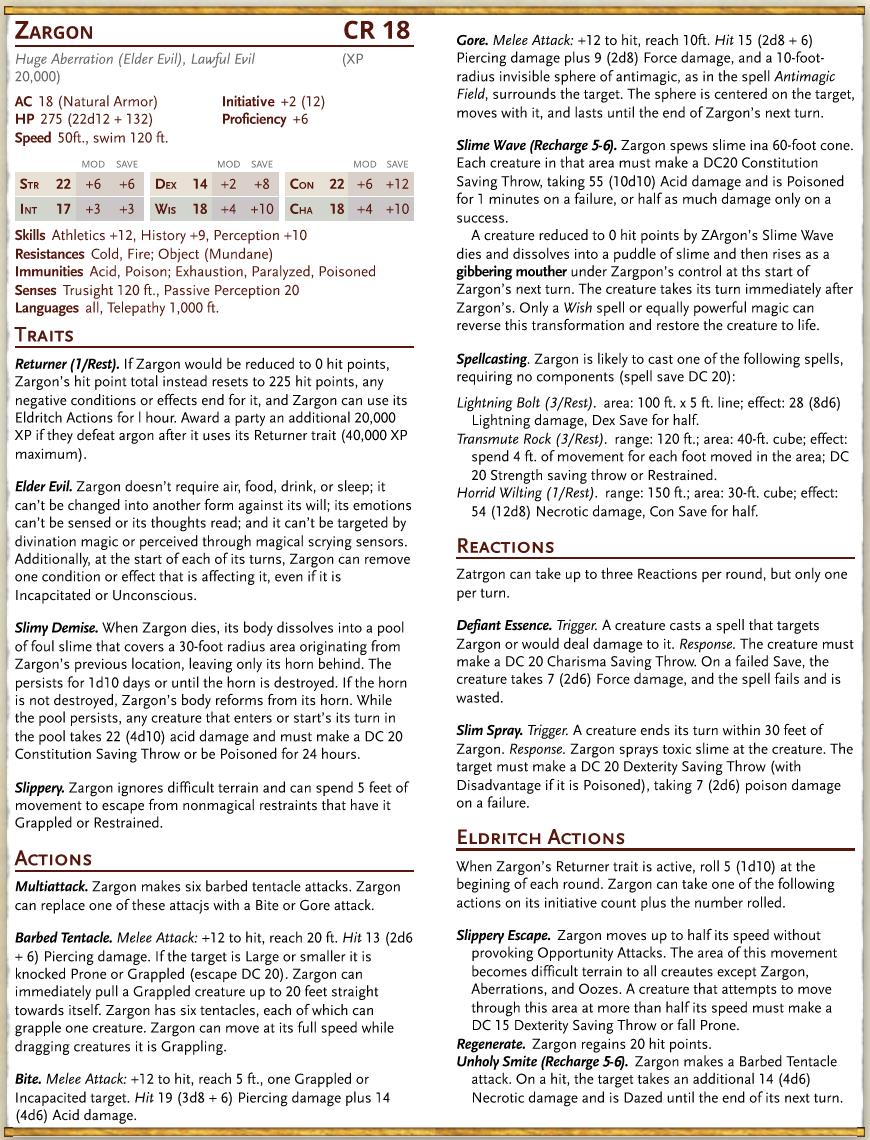 Brandes Stoddard shared the table of contents along with the stats for the elder evil Zargon the Returner.