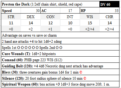 Please note I home brew clerics with more 1st level spell slots but they can't cast cantrip without using a spell slot (no laser clerics and no constant Guidance). That's why cantrip are not listed and the spell slots are high.