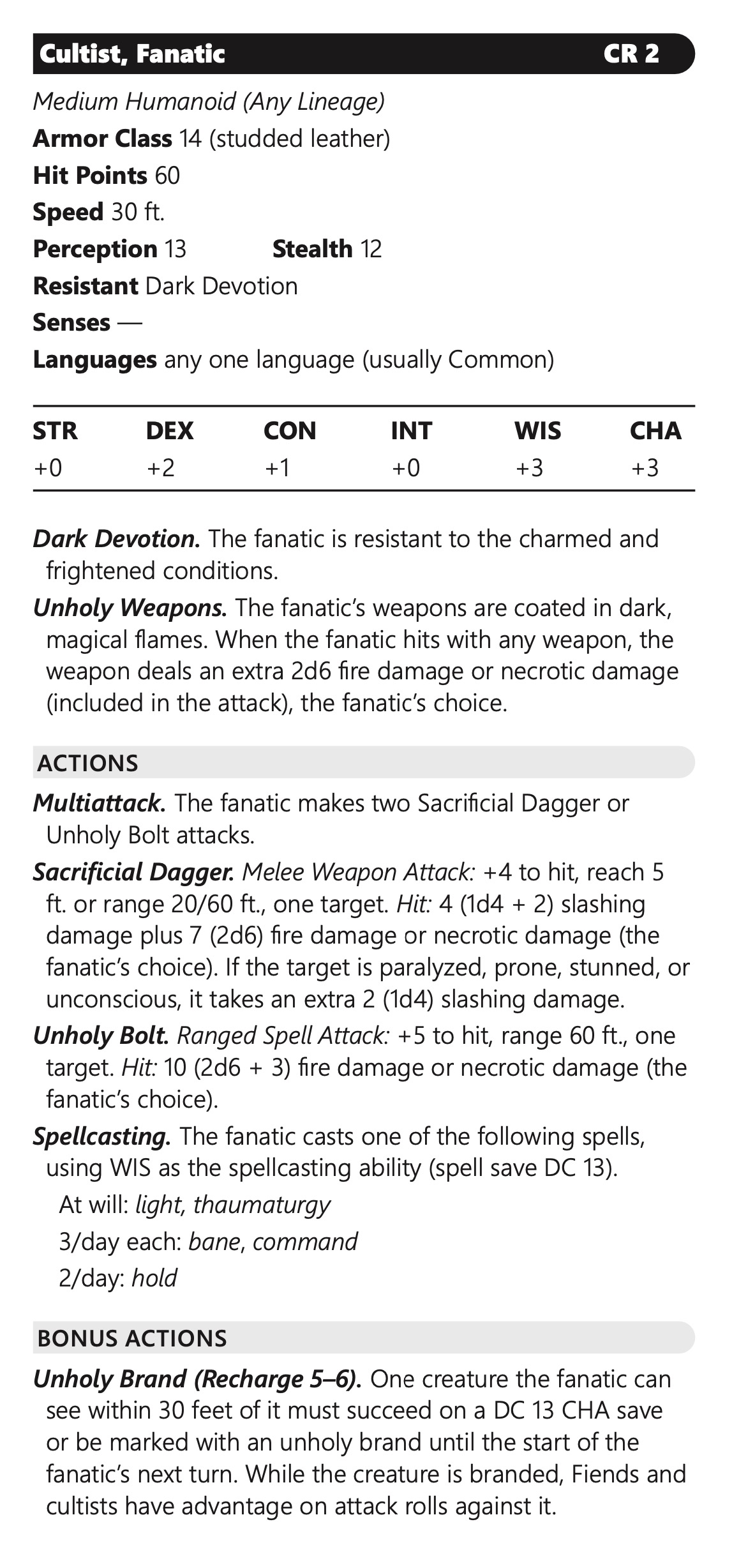 I've been following the TotV/Black Flag monster design, and I see some nice innovations alongside carrying traditional design choices over from 5e that lead to stat block bloat. I thought I'd take a backstab at a re-write of the Cultist Fanatic...