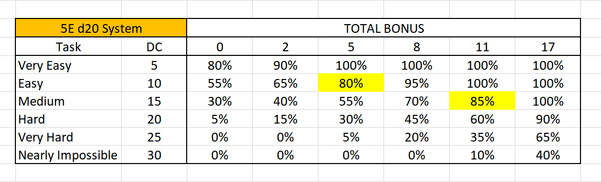 So, let's look at the ability (skill) check system in 5E and chances of success: