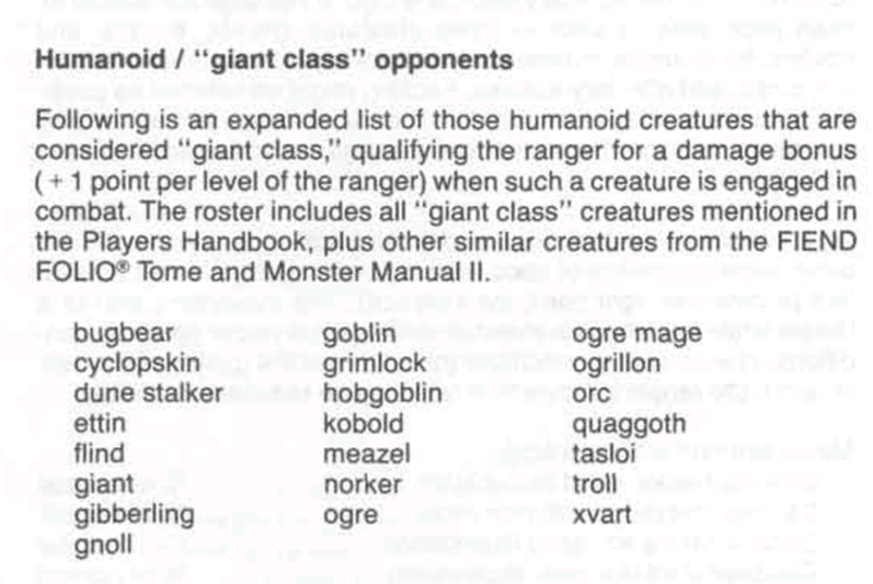 In AD&D 1e the "giant" class for rangers is actually a long list of creatures that goes from kobolds (!) to actual giants. I've never figured why it was called like that (it was there from the original article in Strategic Review).AD&D 1st edition: giants.
