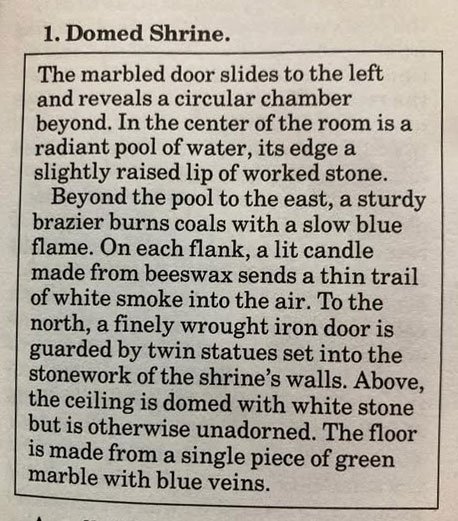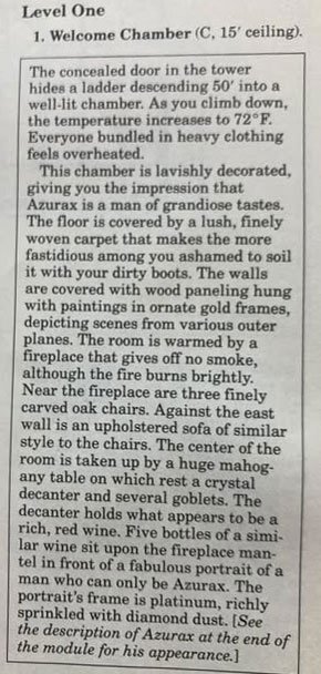 Oh dear. Assuming I'm still awake by the time the DM gets to the end of that, I'll already have forgotten the first half - or will instead be fixated on making sure I grind as much dirt as possible into this guy's poncy carpet, don't tell me what I'm ashamed of.#2 is from "Threshold of Evil" by Scott Bennie (from Dungeon #10 [March/April 1988])