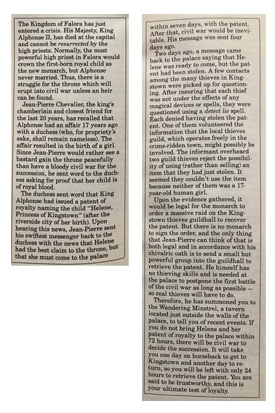 That is one disorganised kingdom. Whether the king ever married or not, he and his nobles would surely have had some concept of the need for a clear succession so this sudden crisis seems forced from the start.#3, rather than a room description is boxed text meant to introduce an adventure (a way I would not introduce an adventure and have not since around the time this mag was published), from "They Also Serve. . ." by Robert Kelk (from Dungeon #10 [March/April 1988])
