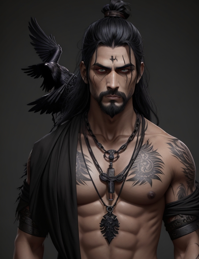 A black iron pendant hangs around his neck, the engraved crow on it serving as a grim reminder of his dark heritage and the weight of his past transgressions. Despite his intimidating aura, there is a certain elegance to Valthor's movements.