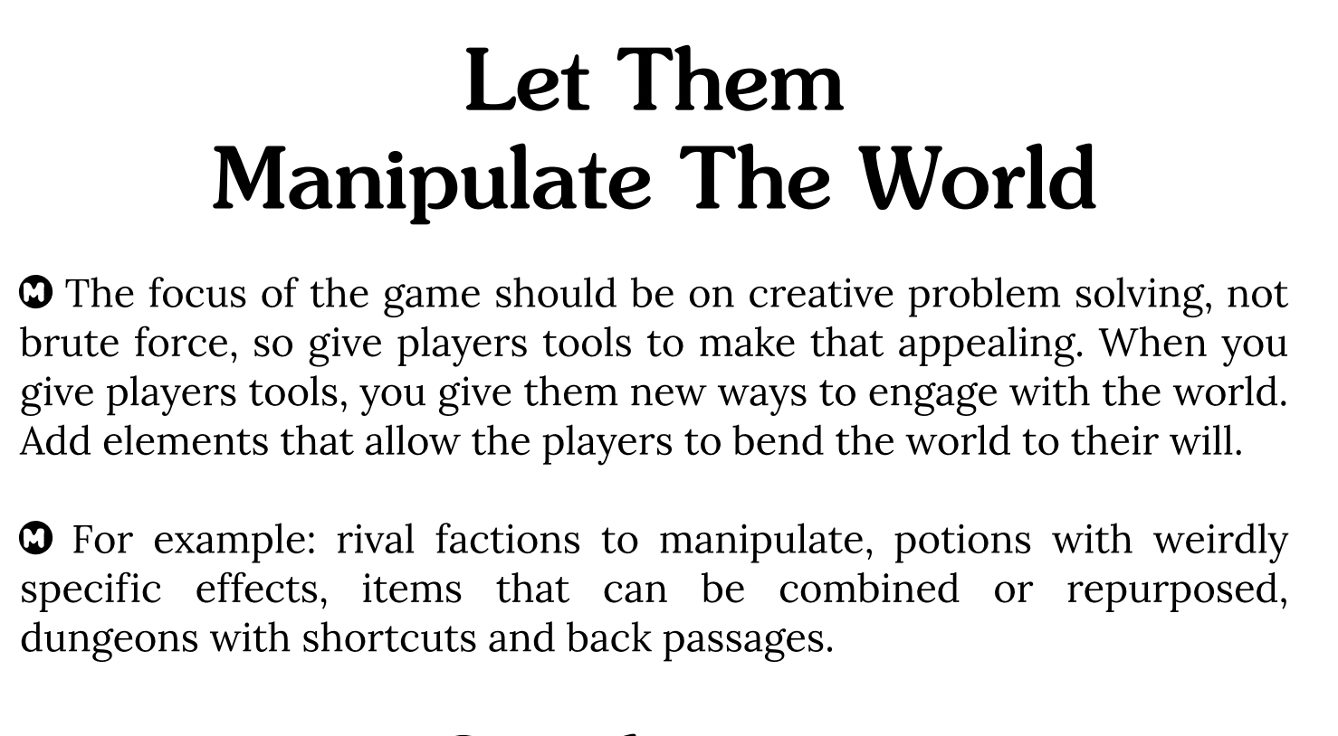 Honestly, this is both blowing my mind and making me even more frustrated by the conversations I've had over the years. If people talked about literally anything like this, I would have had few to no complaints. This is great stuff! As you say, it is very similar in spirit to the Principles and Agendas of PbtA games.Well it's notoriously hard to pin down what the OSR 'is'. But at least for Into the Odd--a hugely influential game in one sector of the OSR--not following the referee advice is akin to not playing by the rules. But I would say this kind of advice is now pretty common among the most cited sources. For example, a couple of selections from the Principia Apocrypha: