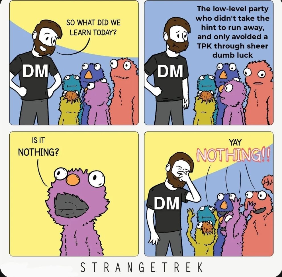 (THINKS): By all that is holy, DON’T go up the stairs by yourself! How often do you as a TTRPG GM/DM/referee pray that a player doesn't do the thing … but they do the thing!?