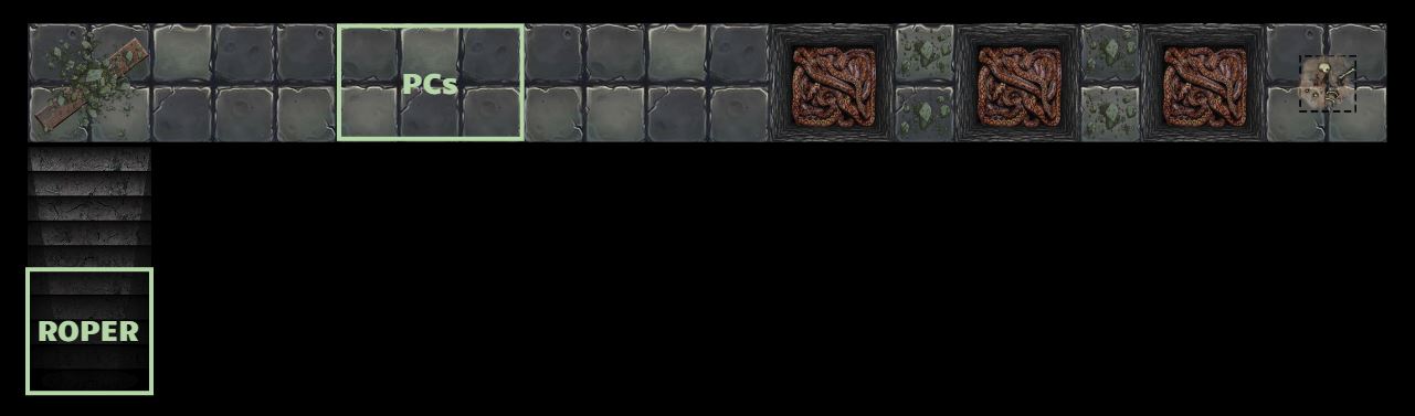 The adventurers rush up the steep stairs, dashing heedlessly through rubble choking the landing. Behind them, the roper's strength-sapping tendrils flail in the darkness, reaching around the corner. The Underdark hunter, drawn from its slumber in the depths below, creeps nearer with each passing second.