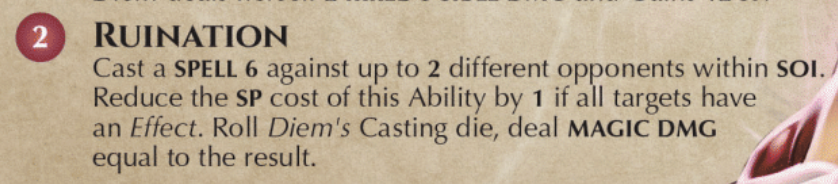 Ruination is an ability from a summon, but it’s effectively an AoE attack. The bolded elements call out the game mechanics. SPELL 6 means to roll your casting die and add 6. The targets have to make conviction checks or take the result (Diem’s casting die worth of MAGIC DMG). The number in the circle is the SP cost to use the ability. You get SP at the start of your turn, which is spent to use abilities, move, etc. An Effect is a beneficial thing (like Haste) or negative (like Poison). Effects are tracked with tokens. Diem is the name of the summon.