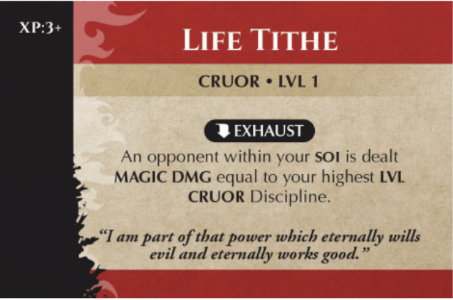 Life Tithe is a Discipline, which is how you customize characters. The XP cost is how many XP you pay to buy it. It costs 3+, meaning three plus how many other LVL 1 Disciplines you have. Disciplines with costs will have icons down the side. This one is “free” but can only be used one per turn by exhausting (i.e., tap) the card. Exhausted cards are recovered at the start of your turn. SOI is a standard distance. By default, it is four squares, but some things can increase it. The player with Life Tithe in our game has an item that increases SOI to six squares.