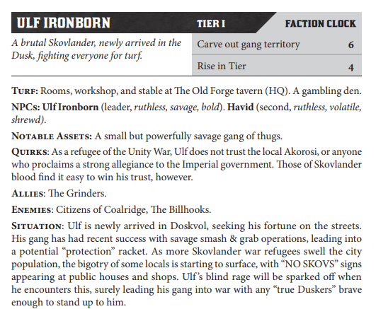 For instance, Harper's Blades in the Dark text is overflowing with evocative language. It drips with it. Now I've run the game so much that I don't really need to look up anything, including Duskvol's 12 districts and the idiosyncratic aspects of the large list of Factions. Take a look at the following entry for Ulf Ironborn: