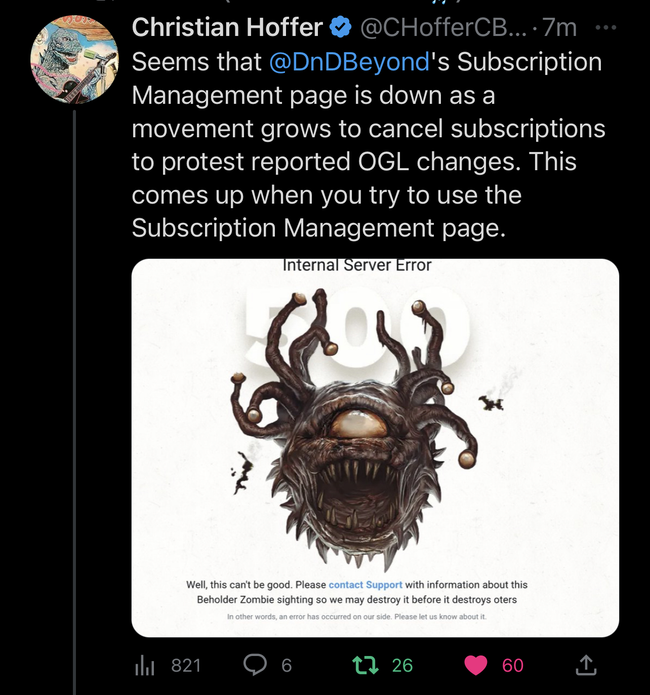 I have decided to reach out because at my time in WotC I have never once heard management refer to customers in a positive manner, their communication gives me the impression they see customers as obstacles between them and their money, the DDB team was first told to prepare to support the new OGL changes and online portal when they got back from the holidays, and leadership doesn't take any responsibility for the pain and stress they cause others. Leadership's first communication to the rank and file on the OGL was 30 minutes on 1/11/23, This was the first time they even tried to communicate their intentions about the OGL to employees, and even in this meeting they blamed the community for over-reacting.
