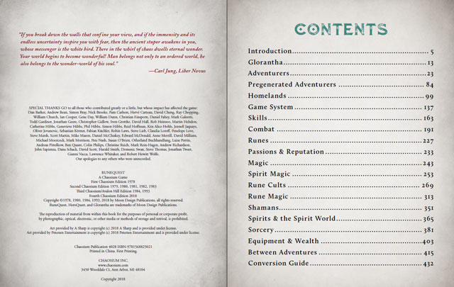The list of acknowledgements includes Pete Nash and Lawrence Whitaker, the authors of the 6th ed. Michael Moorcock is also included, as well as Penelope Love, the author of a cool Gloranthan novel.