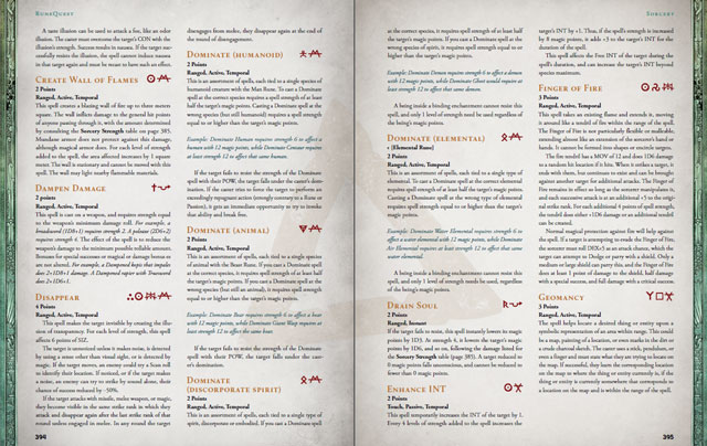 Combat has always been dangerous in RuneQuest and this is no exception in RQG. It is a visceral blow-by-blow exchange that usually ends in a bloody way, with one of the opponents decapitated, bleeding unconscious on the ground or clutching the wound in his severed arm. It's simulationist and it feels quite realistic. If you have no other option than to enter the fray, be sure to wear good armour and cast your protective spells first!
